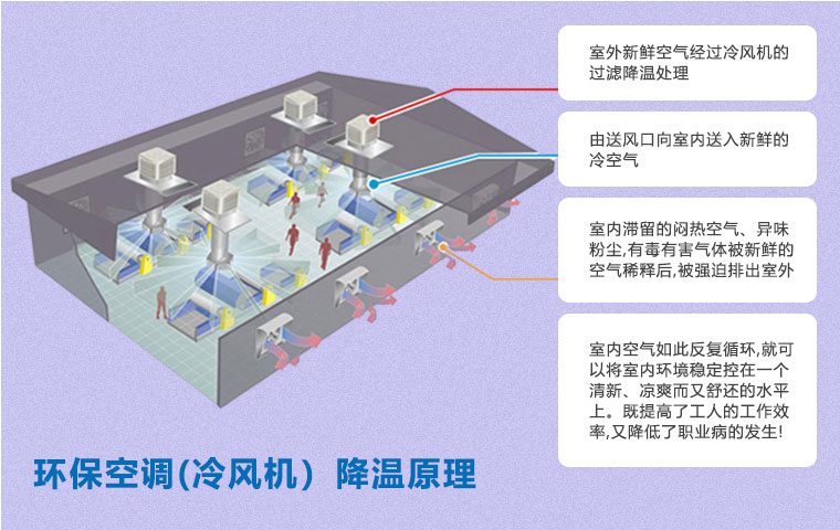 在空氣不流通的環境中,尤其是化工車間,容易產生建筑綜合癥,如悶熱、頭疼、眩暈、過敏、咳嗽等不適癥狀。使用環??照{(冷風機)通風降溫方案即可以有效降溫,又能保證空氣流通